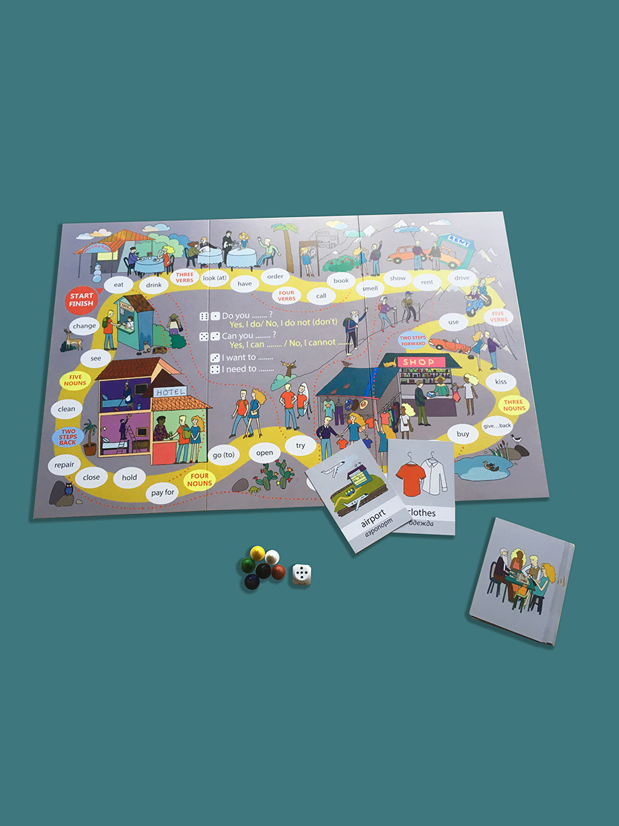 Играя, выучите основные глаголы и существительные и сможете легко объясняться в магазине, ресторане и отеле.