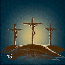Иисуса Христа распяли на кресте вместе с двумя разбойниками, которые оказались по обе стороны от Него. Евангелие от Луки говорит нам, что один из разбойников ругался на Иисуса, а другой, наоборот, унимал первого. Несмотря на близкую смерть, он признал Иисуса Христом и просил Его: «помяни меня, Господи, когда приидешь в Царствие Твое!» (Евангелие от Луки, глава 23, стих 42) Эта невероятная вера разбойника находит отклик у Иисуса: «истинно говорю тебе, ныне же будешь со Мною в раю» (Евангелие от Луки, глава 23, стих 43). Этого человека христианская традиция называет «благоразумным разбойником». (карточка 15)