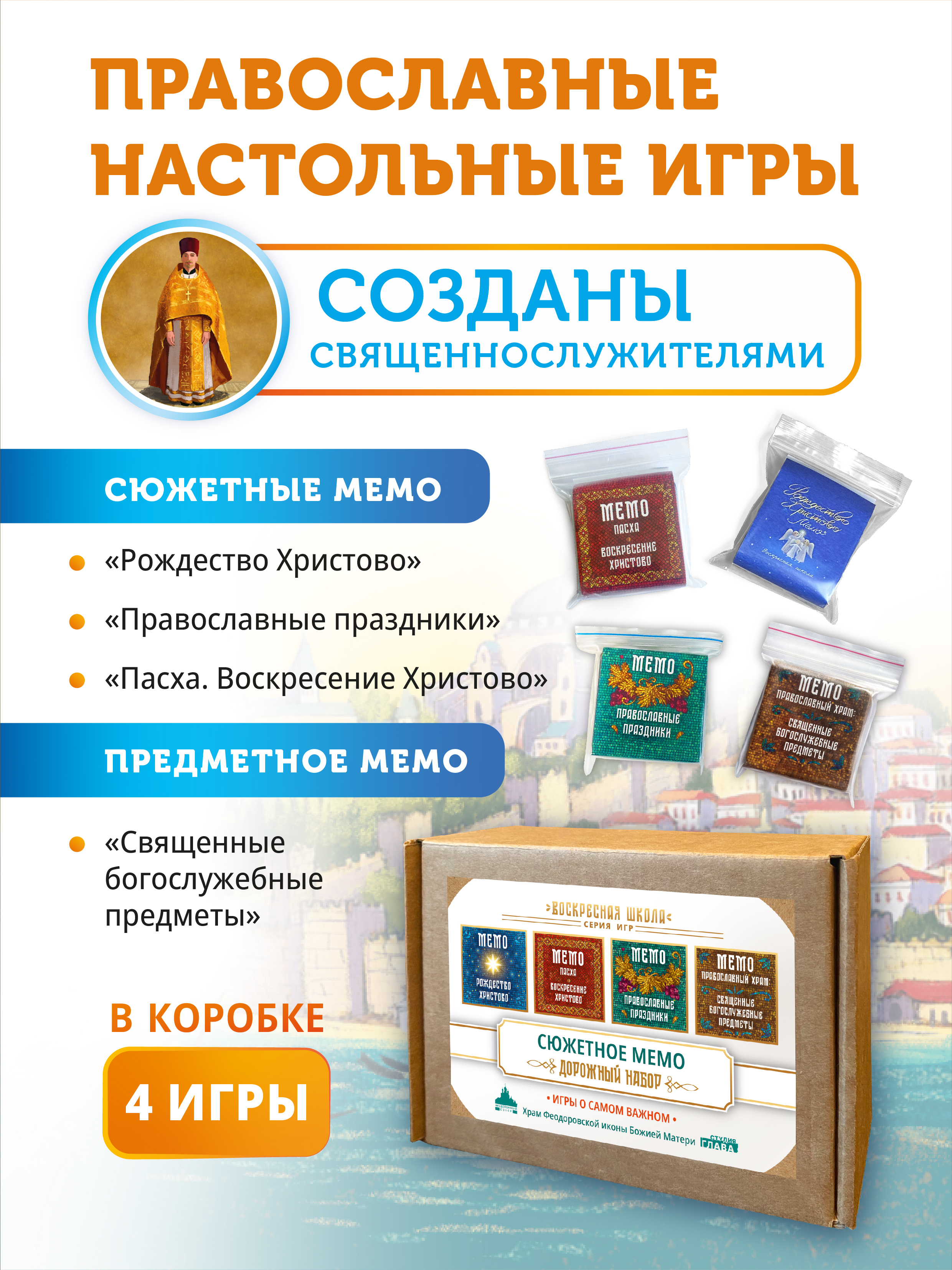 В этой коробке мы приготовили основные игры, которые расскажут о самых важных евангельских событиях и реалиях современной жизни православной Церкви.