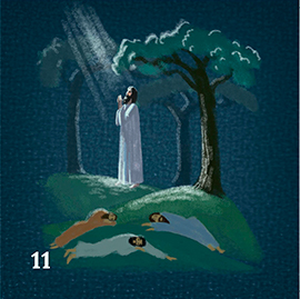 По окончании Тайной вечери Иисус с учениками (без Иуды) отправились в Гефсиманский сад помолиться. Там совершилось так называемое гефсиманское моление, когда Иисус, обращаясь к Отцу Небесному, просил Его: «Отче Мой! если возможно, да минует Меня чаша сия; впрочем не как Я хочу, но как Ты» (Евангелие от Матфея, глава 26, стих 39). Ученики же Его, которых Он просил бодрствовать, не выдержав духовного напряжения и уснули. (карточка 11).