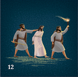 Иуда, когда остальные ученики ушли с Учителем, пошел к первосвященникам, чтобы сообщить им, где найти Иисуса. Хорошо зная место, куда любил ходить молиться Учитель, предатель привел туда стражников, сказав им: «Кого я поцелую, Тот и есть, возьмите Его» (Евангелие от Матфея, глава 26, стих 48). Отсюда пошло выражение «поцелуй Иуды». Иисус был арестован, а Его ученики в страхе разбежались.(карточка 12).