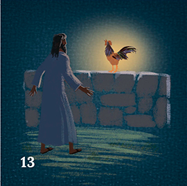 После ареста Иисуса привели к первосвященникам на суд. За ним последовали два ученика, одним из которых был Петр. Находясь на территории, где держали Учителя, Петр был несколько раз узнан. Боясь последствий, Петр три раза утверждал, что не знает Христа, говоря. Именно об этом трехкратном отречении его предупреждал Иисус во время Тайной вечери, когда Петр самонадеянно утверждал, что никогда не сделает этого: «истинно говорю тебе, что в эту ночь, прежде нежели пропоет петух, трижды отречешься от Меня» (Евангелие от Матфея, глава 26, стих 34). И когда запел петух, Петр с ужасом понял, что произошло на самом деле. (карточка 13).