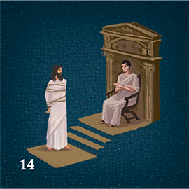 После суда у первосвященников, который обвинил Иисуса в богохульстве и признал достойным смерти, Его отправили к Понтию Пилату, римскому наместнику в Иудее. Только римская власть могла исполнить смертный приговор, а для этого должны были быть веские причины. Пилат не нашел в деле Иисуса достаточных оснований для смертной казни и хотел Его отпустить, подвергнув только телесным наказаниям. Но первосвященники и старейшины искусно «подловили» Пилата, намекнув: «если отпустишь Его, ты не друг кесарю; всякий, делающий себя царем, противник кесарю» (Евангелие от Иоанна, глава 19, стих 12). Тогда Пилат предал Иисуса на распятие (таким способом казнили разбойников). (карточка 14)